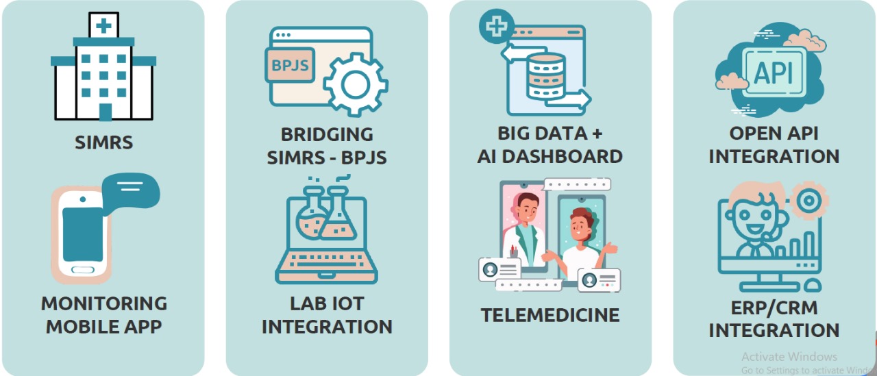 Smart Hospital Solution integrates hospital management systems (SIMRS), BPJS bridging, telemedicine, big data analytics, and open API integration to enhance healthcare efficiency, improve patient experience, and support data-driven decision-making.