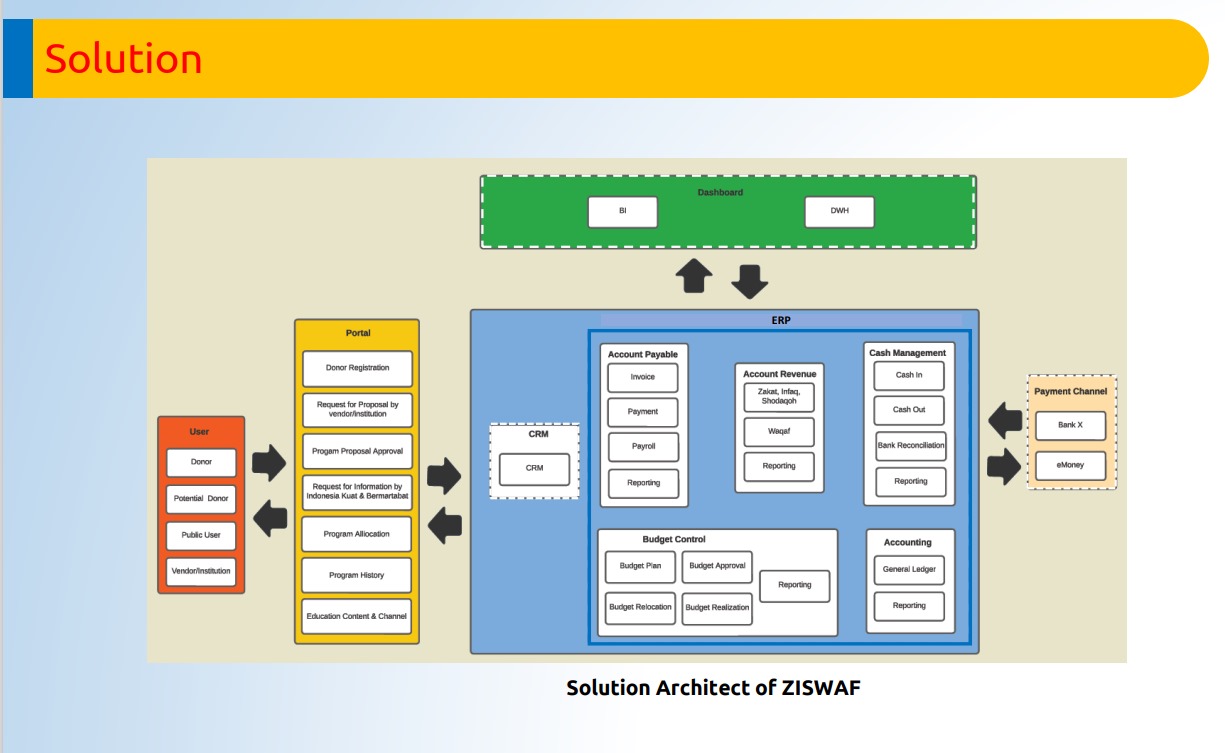 The ZISWAF application solution architecture provides an integrated digital ecosystem for managing zakat, infaq, sadaqah, and waqf efficiently through secure transactions, real-time reporting, and seamless connectivity between donors and institutions.